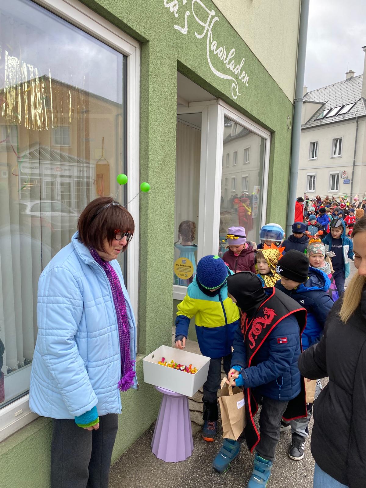 Entlang der Strecke warteten viele Pernitzer Geschäfte auf uns und begrüßten die Kinder mit einem Lächeln – und natürlich mit reichlich Süßigkeiten, die für strahlende Augen und gut gefüllte Sackerl sorgten. Ein herzliches Dankeschön an alle Betriebe, die unseren Faschingsumzug so herzlich unterstützt haben!